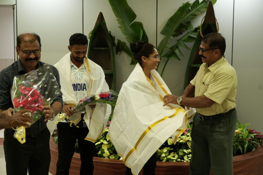 ഹാങ്ചോ ഏഷ്യൻ ഗെയിംസിൽ മികച്ച പ്രകടനം കാഴ്ച വെച്ച് തിരിച്ചെത്തിയ താരങ്ങളെ തിരുവനന്തപുരം വിമാനത്താവളത്തിൽ ഗംഭീര സ്വീകരണം. 4 X 400 മീറ്റർ റിലേയിൽ സുവർണ നേട്ടം സ്വന്തമാക്കിയ മുഹമ്മദ് അനസ്, മുഹമ്മദ് അജ്മൽ 4 X 400 മീറ്റർ വനിത റിലേയിൽ വെള്ളി നേടിയ ടീമിലെ അംഗമായ ഐശ്വര്യ മിശ്ര എന്നിവരാണ് നാട്ടിൽ മടങ്ങിയെത്തിയത്.