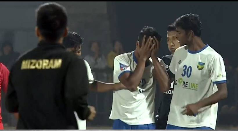 സന്തോഷ് ട്രോഫി ഫുട്‌ബോളിൽ കേരളം സെമി കാണാതെ പുറത്ത്. നിശ്ചിത സമയവും എക്സ്ട്രാ ടൈമും പെനൽറ്റി ഷൂട്ടൗട്ടിലേക്ക് പോരാട്ടത്തിലേക്കാണ് കേരളം വീണത്. കേരളത്തിനെതിരെ 7–6ന്റെ വിജയം കുറിച്ചാണ് മിസോറം സെമിയിലേക്ക് കടന്നത്. പെനാൽറ്റി ഷൂട്ടൗട്ടിലും തുല്യതപാലിച്ചതോടെ മത്സരം സഡൻഡത്തിലേക്ക് കടന്നു. സഡൻഡത്തിൽ കേരളതാരം സുജിത് പെനാൽറ്റി മിസ്സാക്കി. ഇതോടെ വിജയം നേടി മിസോറം സെമിയിലേക്ക് ടിക്കറ്റ് നേടി.