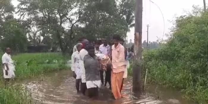 റോഡും പാലവും മഴയിൽ വെള്ളത്തിനടിയിൽ ആയതിനാൽ മൃതദേഹം വെള്ളക്കെട്ടിനു നടുവിലൂടെ ബന്ധുക്കളും അയൽക്കാരും ചേർന്ന് ചുമന്ന് വീട്ടിലെത്തിച്ചു. കോട്ടയം ജില്ലയിലെ പെരിങ്ങര പഞ്ചായത്തിലെ ചാലക്കുഴിയിലാണ് സംഭവം. കഴിഞ്ഞ ദിവസങ്ങളിൽ പെയ്ത മഴയെ തുടർന്ന് നാലടിയോളം വീതി വരുന്ന റോഡും പാലവും വെള്ളത്തിനടിയിലായിരുന്നു. പകരം തെങ്ങിൻ തടിയും ഇരുമ്പുപാളികളും ചേർത്ത് താത്ക്കാലികമായി ഒരു പാലം നിർമിച്ചിരുന്നു. വീണ്ടും പെയ്ത അതി ശക്തമായ മഴയിൽ ഈ പാലവും തകർന്നു.
