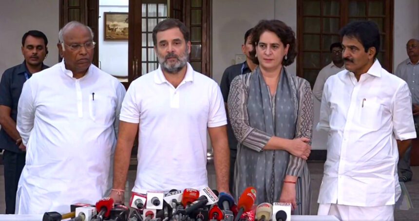 രാഹുല്ഗാന്ധി വയനാട് മണ്ഡലം ഒഴിയും. രാഹുല് ഒഴിയുന്ന വയനാട്ടില് പ്രിയങ്ക ഗാന്ധി മത്സരിക്കാനും തീരുമാനമായി. ഇന്ന് വൈകീട്ട് കോണ്ഗ്രസ് അധ്യക്ഷന് മല്ലികാര്ജുര് ഖാര്ഗെയുടെ വസതിയില് ചേര്ന്ന യോഗത്തിലാണ് ഇതുസംബന്ധിച്ച് പ്രഖ്യാപനം ഉണ്ടായത്.