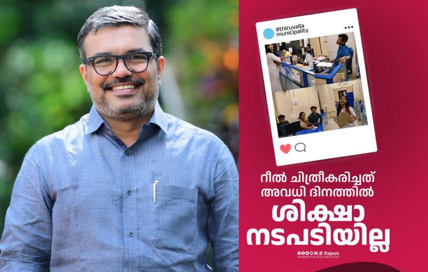 തിരുവല്ല നഗരസഭയിൽ റീൽസ് ചിത്രീകരിച്ച് സാമൂഹിക മാധ്യമങ്ങളിൽ പോസ്റ്റു ചെയ്ത ഉദ്യോഗസ്ഥർക്കെതിരെ നടപടി എടുക്കരുതെന്ന് തദ്ദേശ സ്വയം ഭരണ വകുപ്പു മന്ത്രി എം ബി രാജേഷ് നിർദ്ദേശം നൽകി. ഞായറാഴ്ച പൊതു അവധിയായിരുന്നിട്ടു കൂടി കളക്ടറുടെ പ്രത്യേക നിർദേശ പ്രകാരമാണ് ഉദ്യോഗസ്ഥർ ഡ്യൂട്ടിക്കെത്തിയത്. മഴക്കാലമായതിനാൽ അവധി ദിനത്തിൽ ഓഫിസിൽ എത്തണമെന്ന് ഉദ്യോഗസ്ഥർക്ക് ജില്ലാ കളക്ടർ നിർദേശം നൽകിയിരുന്നു.
