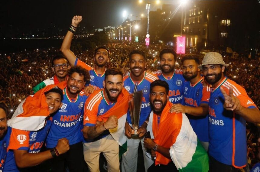 തുറന്ന വാഹനത്തിൽ ഇന്ത്യൻ താരങ്ങൾ തങ്ങളെ കാണാനെത്തിയ ലക്ഷങ്ങളെ അഭിവാദ്യം ചെയ്തു. താരങ്ങളുടെ പേരെടുത്തു വിളിച്ച് കാണികൾ ആവേശത്തിലാറാടുകയായിരുന്നു. രോഹിതും വിരാടും ഒരുമിച്ച് നിന്ന് ഒരു വട്ടം വിശ്വകിരീടം വാനിലേക്കുയർത്തിയപ്പോൾ ചുറ്റുപാടും പൊട്ടിത്തെറിച്ചു. ഹാർദിക് പാണ്ട്യയുടെ കൈകളിലിരുന്ന് ഇന്ത്യൻ പതാക വാനിൽ പാറി ഉയർന്നു. ആരാധകർക്കൊപ്പം നൃത്തം വച്ചും പാട്ടുപാടിയും താരങ്ങൾ ആഹ്ലാദത്തിലമർന്നു. തുടർന്ന് വംഖഡെ സ്റ്റേഡിയത്തിൽ ബി സി സി ഐയുടെ നേതൃത്വത്തിൽ ടീമിനെ ആദരിക്കുകയും ചെയ്തു.