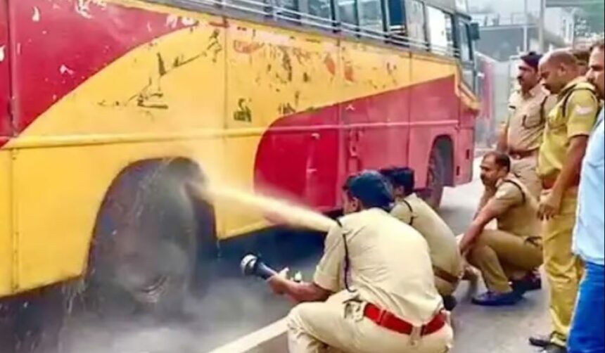 ഓടിക്കൊണ്ടിരുന്ന കെഎസ്ആർടിസി ബസിന്റെ ടയറിന് തീപിടിച്ചു