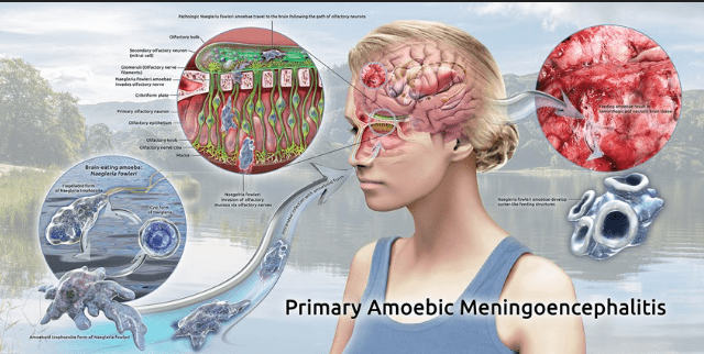 മൂക്കിനേയും മസ്തിഷ്‌കത്തേയും വേർതിരിക്കുന്ന നേർത്ത പാളിയിലുള്ള സുഷിരങ്ങൾ വഴിയോ കർണ്ണ പടലത്തിലുണ്ടാകുന്ന സുഷിരം വഴിയോ അമീബ തലച്ചോറിലേക്ക് കടക്കുകയും മെനിഞ്ചോ എൻസെഫലൈറ്റിസ് ഉണ്ടാക്കുകയും ചെയ്യുന്നു. 97 ശതമാനത്തിലധികം മരണനിരക്കുള്ള രോഗമാണിത്. രോഗം മനുഷ്യരിൽ നിന്നും മനുഷ്യരിലേക്ക് പകരില്ല. വെള്ളത്തിലിറങ്ങുമ്പോൾ അടിത്തട്ടിലെ ചെളിയിലുള്ള അമീബ വെള്ളത്തിൽ കലങ്ങുകയും മൂക്കിലൂടെ ശരീരത്തിൽ പ്രവേശിക്കുകയും ചെയ്യുന്നു. രോഗാണുബാധ ഉണ്ടായാൽ ഒന്ന് മുതൽ ഒൻപത് ദിവസങ്ങൾക്കുള്ളിൽ രോഗലക്ഷണങ്ങൾ പ്രകടമാകും.