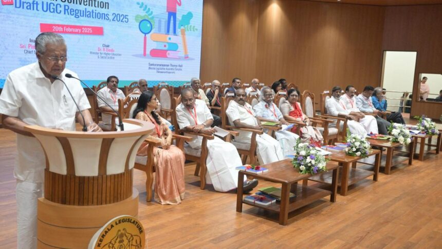 പ്രതിപക്ഷ പാര്‍ട്ടികള്‍ ഭരിക്കുന്ന തെക്കേ ഇന്ത്യന്‍ സംസ്ഥാനങ്ങളുടെ ഒരു കൂട്ടായ്മയായി മാറി യു ജി സി കരടു നിര്‍ദേശങ്ങള്‍ക്കെതിരെ കേരളം സംഘടിപ്പിച്ച കണ്‍വെന്‍ഷന്‍. ആരെയും വി സിയാക്കാനാകുന്ന കരട് നിർദ്ദേശം ഭരണഘടനാ വിരുദ്ധവും സംസ്ഥാനങ്ങളുടെ അധികാരം കവരുന്നതുമാണെന്നും മുഖ്യമന്ത്രി തുടർന്നു പറഞ്ഞു. ചാൻസലർമാരെ ഉപയോഗിച്ച് ബി ജെപി ഇതര സംസ്ഥാനങ്ങളിൽ കേന്ദ്രം രാഷ്ട്രീയ ഇടപെടൽ നടത്തുകയാണെന്നും അദ്ദേഹം വിമർശനം ഉന്നയിച്ചു.