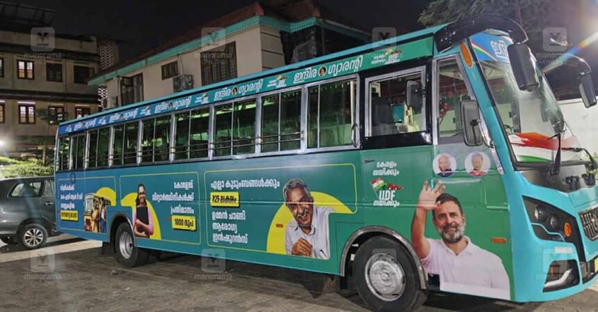 ‘പുതുയുഗ കേരളത്തിന് ഇന്ദിര ഗ്യാരന്റി’ എന്ന സ്റ്റിക്കർ ബസിന്റെ പിന്നിലും കാണാം. രാഹുല് ഗാന്ധി, സോണിയ ഗാന്ധി, കോണ്ഗ്രസ് പ്രസിഡന്റ് മല്ലികാർജുൻ ഖർഗെ, ഇന്ദിര ഗാന്ധി എന്നിവരുടെ ചിത്രങ്ങളാണ് ബസിന്റെ പുറംവശങ്ങളില് ഉള്ളത്. ഇൻഷുറൻസ് സംബന്ധിച്ച എഴുത്തിനൊപ്പം ഉമ്മൻ ചാണ്ടിയുടെ ചിത്രം ഉണ്ട്. മറ്റ് കേരള നേതാക്കളുടെ ചിത്രങ്ങളൊന്നും ബസില് ഇടം നേടിയിട്ടില്ല.