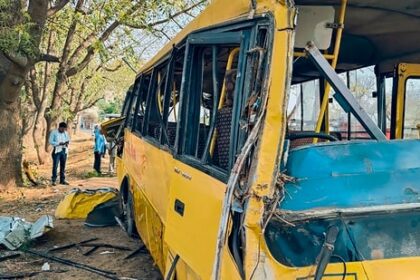 സ്കൂൾ ബസ് നിർത്തിയിട്ടിരുന്ന ക്രൈയിനിനു പിന്നിൽ ഇടിച്ച് ആറു പേർക്ക് പരിക്ക്.